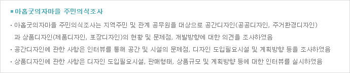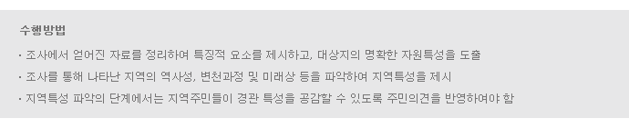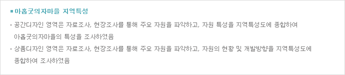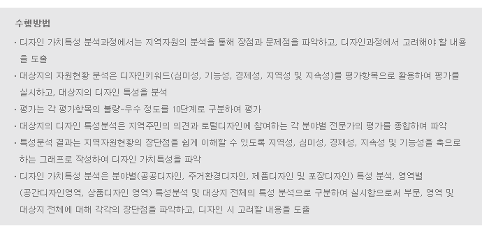 지역성을 제고하기 위한 디자인 개발 및 공공시설의 통일성 제고를 위한 디자인 계획 수립 |