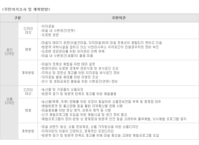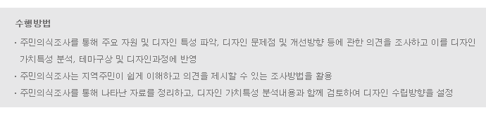 지역성을 강화해서 심미성 및 지속성을 높일 수 있는 디자인 계획 수립 |