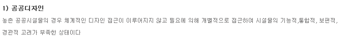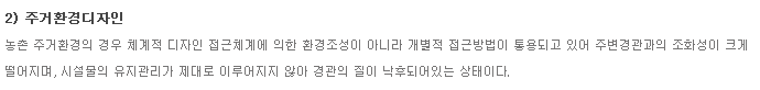 | 경제성 측면 | 가. 획일적 디자인, 조악한 품질, 저렴한 예산의 상품개발로 전체 농가소득에 기여가 미흡함 |