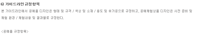 | 색상 및 소재 | 공예품 디자인을 위한 사용소재 및 색상. 도색 방법 등의 범위를 규정한다. |