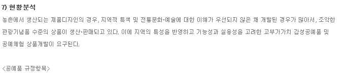 다. 농촌의 지역적 특성을 반영한 독창적 디자인의 다양한 제품 디자인 개발이 요구됨 |