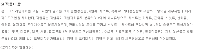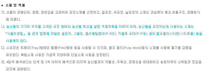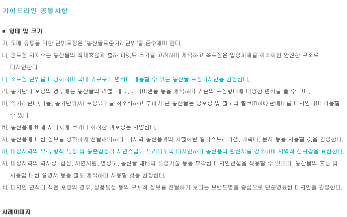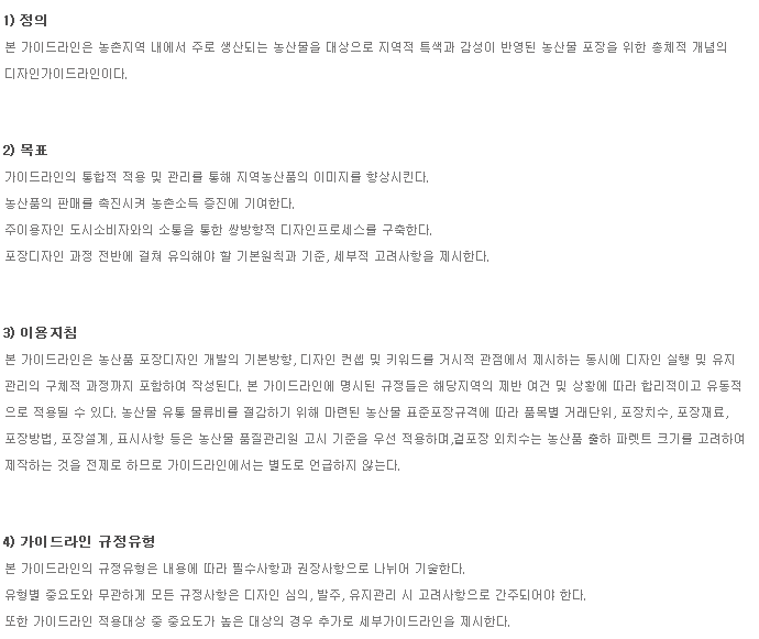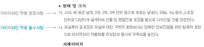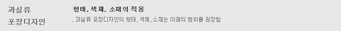 | 형태 및 크기 | 농산물 포장소재의 속성과 색채사용 범위를 규정한다. |