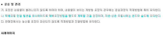| 운송 및 관리 | 농산품의 이동 운반 및 판매, 유통, 환경적 관리 요건 등을 규정한다. |