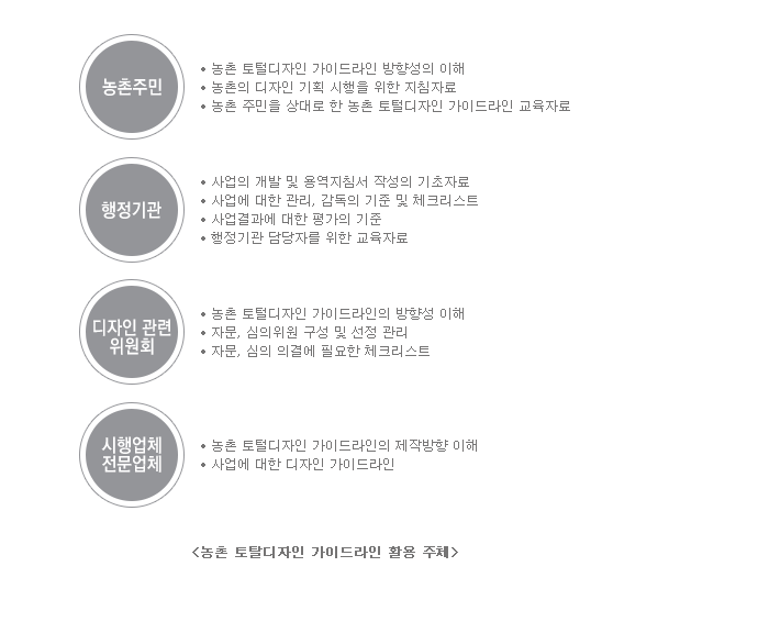 ㆍ농촌토털디자인가이드라인의 활용주체는 행정기관, 디자인 관련 위원회, 전문업체, 시행업체 및 농촌 주민으로써 각 주체별 활용 내용은 다음과 같다.